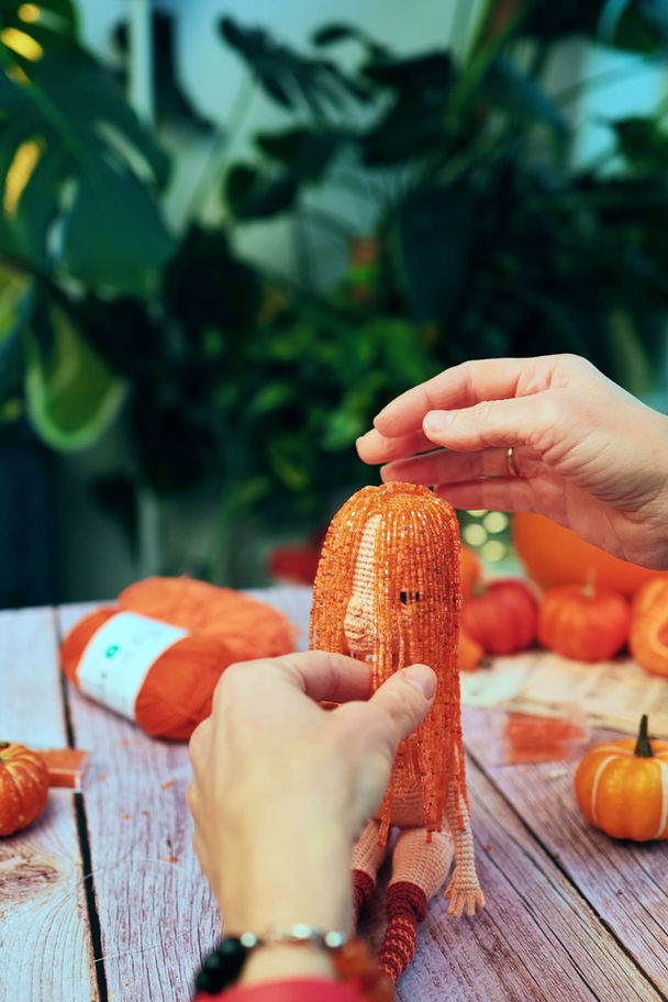 Hair made from seed beads is a beautiful idea that brings a distinct sense of magic to any doll. The tiny beads catch the light in a way that gives the hairstyle depth and shimmer, turning it into a real focal point. You can play with colors, lengths, and patterns to give each doll its own personality, and the final result always looks unique and eye-catching.