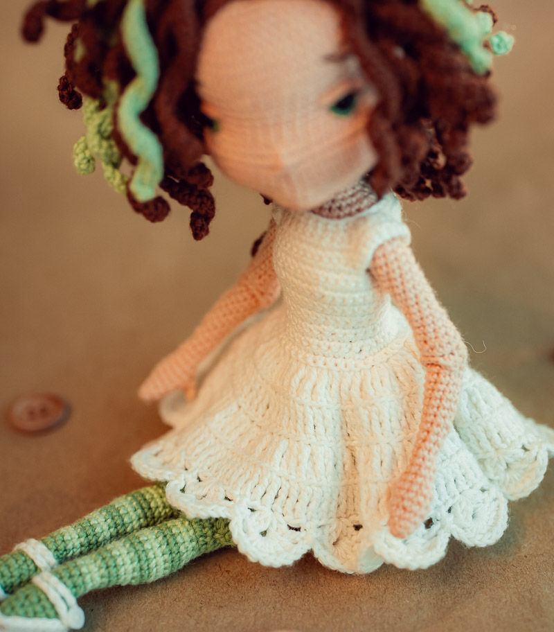 The dress is crocheted from the same cotton yarn as the doll. It features a high waistline and an almost circular skirt. For extra volume, I usually add a crocheted underskirt to these dresses.
